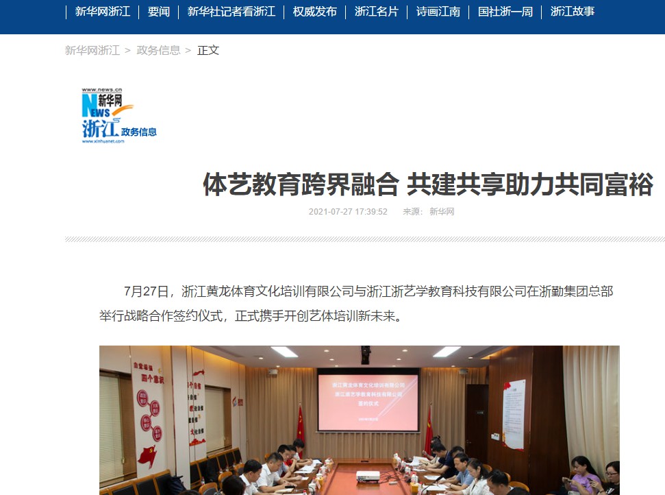 7月27日,浙江黄龙体育文化培训有限公司与浙江浙艺学教育科技有限公司在浙勤集团总部举行战略合作签约仪式,正式携手开创艺体培训新未来。