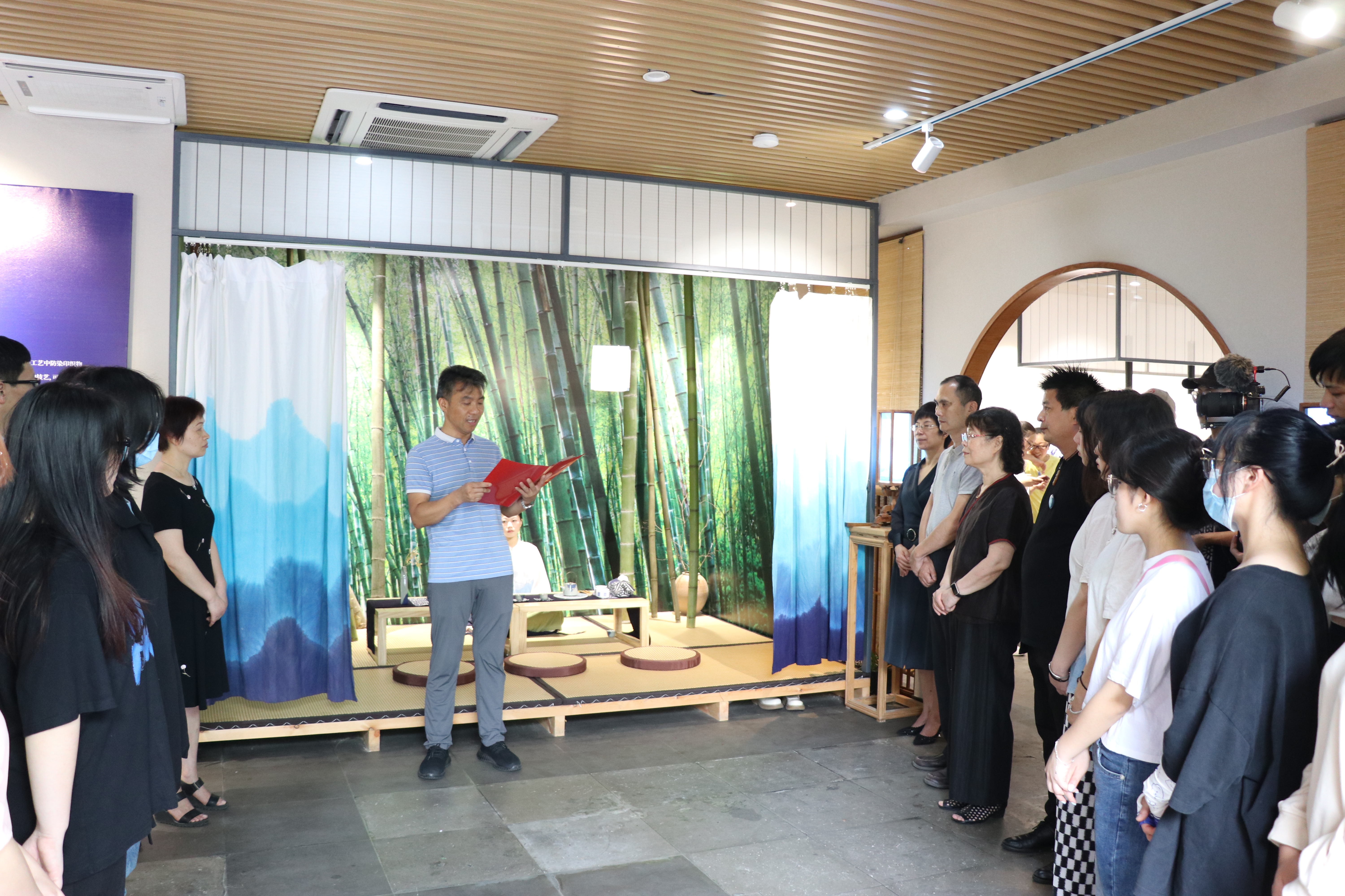 沈军甫致开幕词。他表示本次非遗夹缬文化创新艺术展是“艺海撷英”系列的第三场展览,展示了方寸蓝白间里的人文印记。通过传统夹缬技艺与新时代的巧妙融合展现非遗文化新魅力,是校企合作又一突破。双方合作搭建实践学习平台,进一步推进校行企协同联动,产学研培一体化建设,精准实现人才供需对接。通过产教融合,进行有效的资源整合,更好地助力“夹缬”技艺的匠心传承,推动现代职业教育培养更多优秀技能人才。