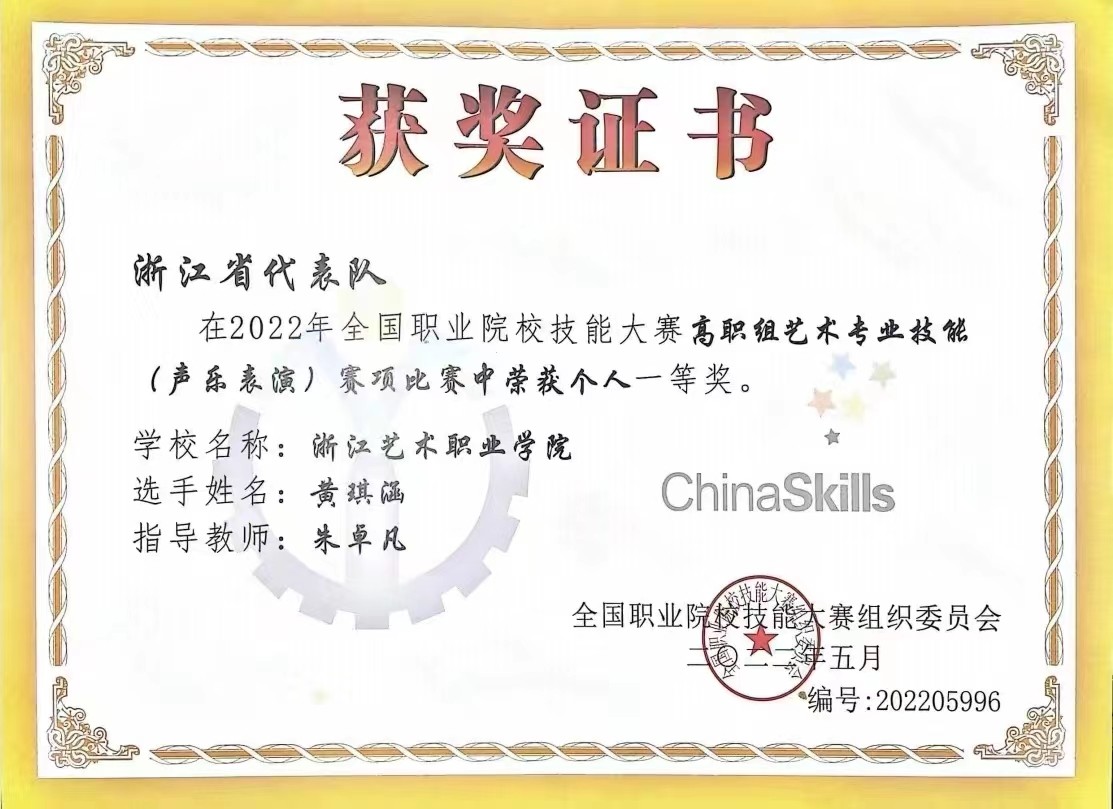 近年来,在全国职业院校技能大赛中,浙艺也是喜报频传:王璟、应梦霞在大赛音乐表演赛项获得2个一等奖;庄海兰、周衍磊、娄瑜桐在大赛舞蹈赛项获3个一等奖;王楚卿、俞嘉睿和王依凡、周函霏在中(高)职组弹拨乐器演奏赛项中获4个一等奖;黄爽在大赛声乐表演赛项中以总分第1获民族组一等奖;杨咏琪、丁沛孜、卢笑恬在大赛戏曲表演赛项获一等奖;谢怡婷在声乐表演赛项中以总分第1获一等奖,等等。