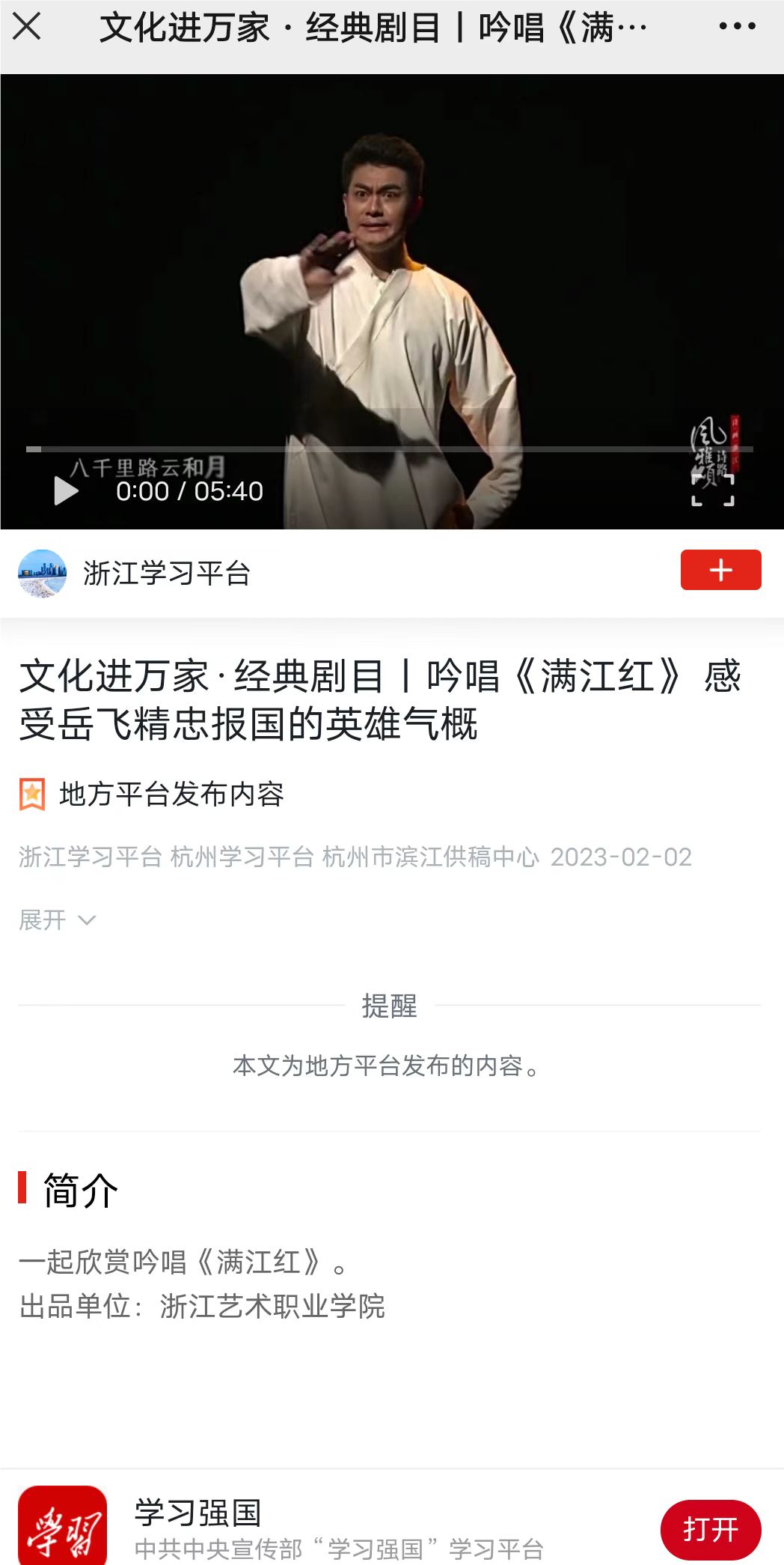 学习强国浙江平台:文化进万家·经典剧目丨吟唱《满江红》 感受岳飞精忠报国的英雄气概