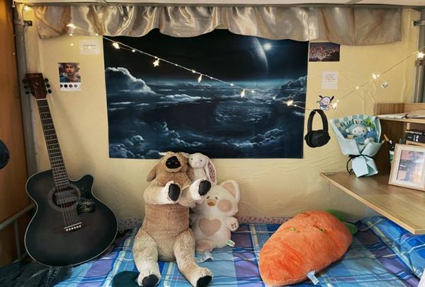 寝室宣言:我们的宿舍所学的专业是公共定向,我们寝室到了晚上时常会坐在一起,打开星星灯,边弹奏吉他边唱歌,极具氛围感,因此给寝室亲切地取名为浪漫星河小屋。一开学,我们就布置了一面寝室介绍墙,墙上贴了六张卡片,上面分别有舍友的证件照、星座、爱好,座右铭等等,我们想通过这一方式来减少大家的距离感,更快熟悉彼此。另外,我们也有一面照片墙,贴着我们寝室舍友的个人照和寝室团体照,希望三年后那面墙已经充满了专属我们六人的回忆。日常生活中,我们每天都安排一位成员值日,宿舍卫生安排井然有序,每个人都为宿舍付出自己的一份力,使宿舍时刻保持着整洁干净,也营造了更好的学习环境。我们寝室有来自歌舞、戏剧表演和视觉专业的同学,希望大家都在各自的领域闪闪发光,做更好的自己,同时兼顾好专业课和文化课。当然,大家忙碌一天后,别忘了有我们温暖的414小家庭在永远等着大家。