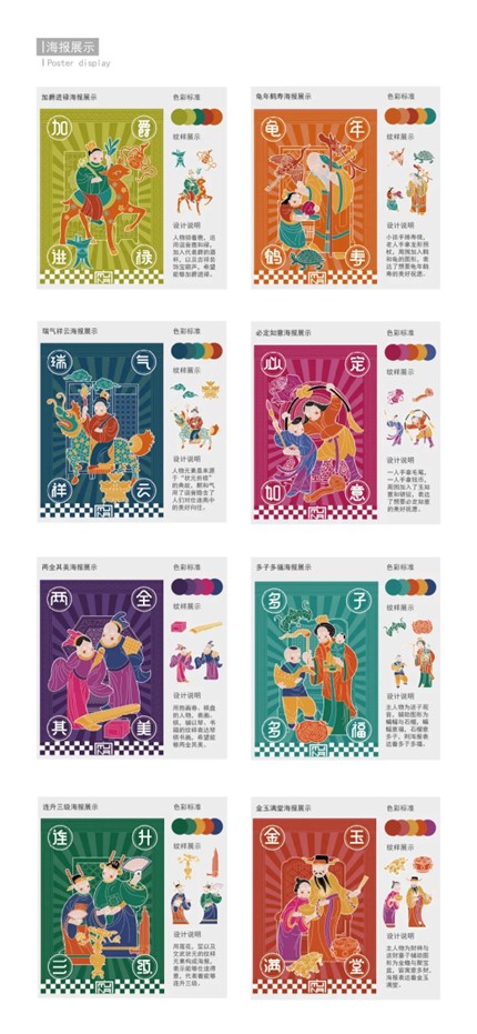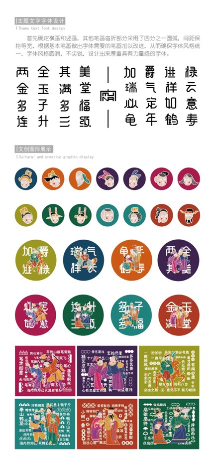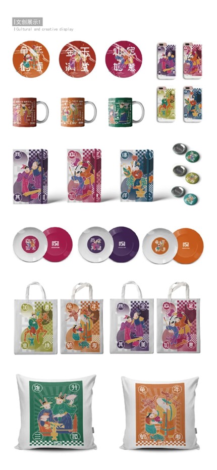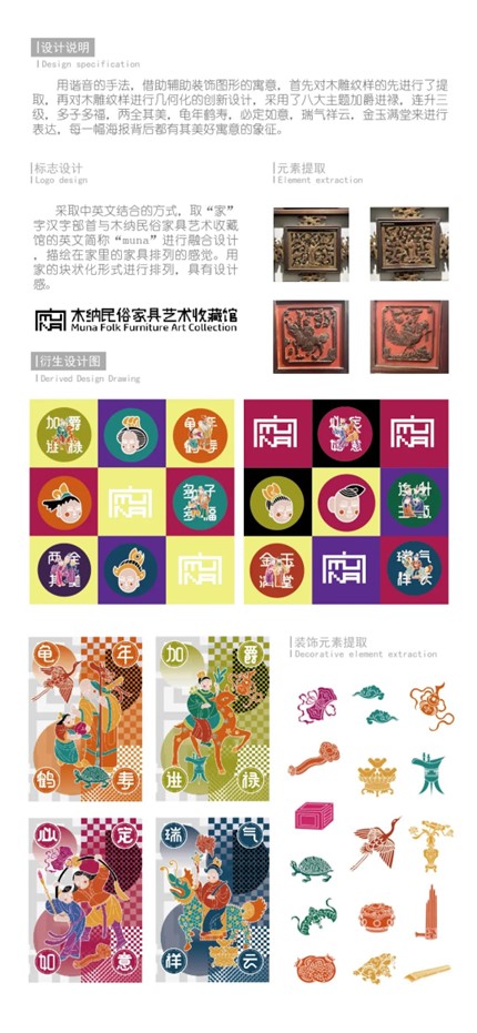 设计说明:本课题以杭州仓前镇越王村的第一批非遗工坊--萧山区木纳民俗家具艺术馆为实践实施案例,进行浙江传统家具木雕技艺的视觉形象品牌建立和传承创新设计,并应用于衍生文创品的市场开发推广。作品将福、禄、寿、喜、财、文、子、乐为主题进行创作,以创新方式表达传统纹样中图必有意的吉祥寓意,体现中国文化独特审美观念和丰富的民俗人人文。课题通过传承非遗文化,结合现代表现手法,重构传统木雕纹样,设计创新图形,转化文创价值,以建立木纳家具木雕品牌在现代新的形象视觉系列。