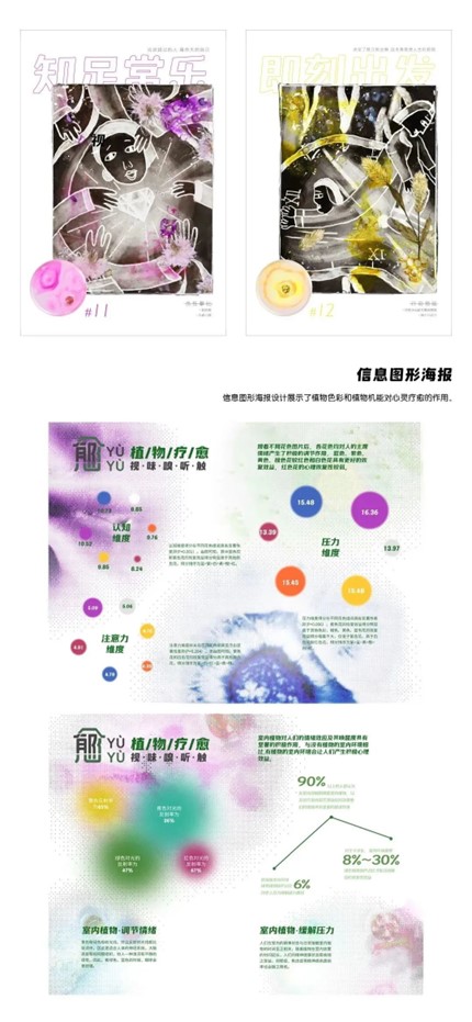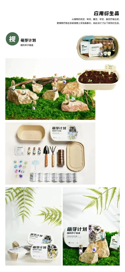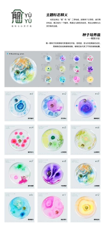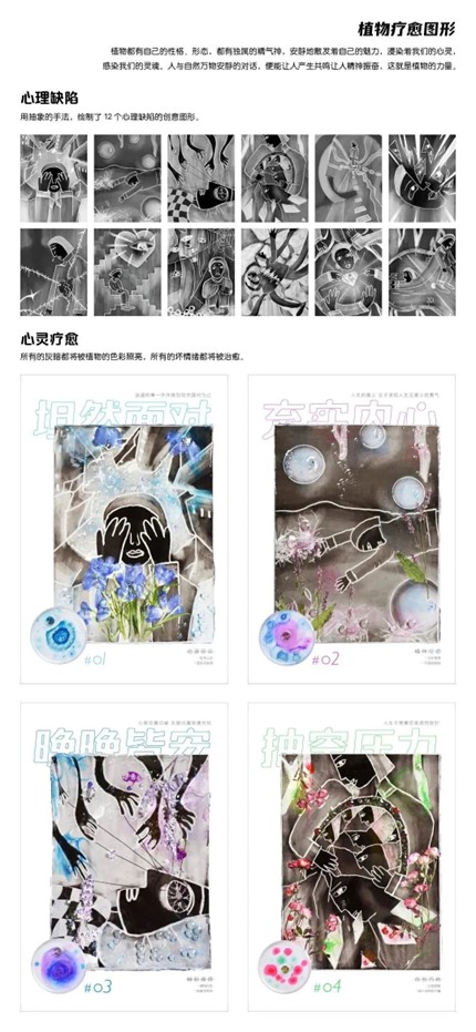 设计说明:植物对心灵的疗愈能力是温柔的且强大的,在这个浮躁的快时代里,安抚着每一颗焦虑的心。社会压力的增大致使越来越多的人意识到自身存在着心理缺陷问题,植物便充当了填补空缺的角色。“郁”,用人物视觉图形诠释12种心理缺陷问题。“愈”,用植物疗愈心灵,以植物种子为主体制作12幅“萌芽计划”种子培养皿,结合“郁”的部分设计了12幅心灵疗愈海报。通过“植物疗愈”信息图形海报更深层剖析植物对心灵疗愈的作用。植物疗愈心灵主要在视觉、味觉、嗅觉、听觉、触觉五种感官方式,为了感受植物的疗愈力,设计了五感系列衍生品,试图用植物最纯净的疗愈力量,让我们告别所有的压力和焦虑,关注自己的心理健康。