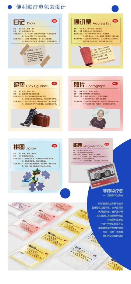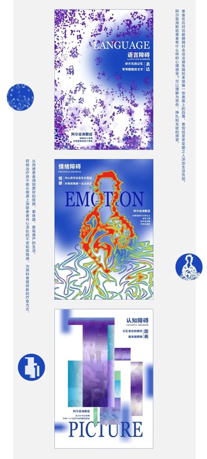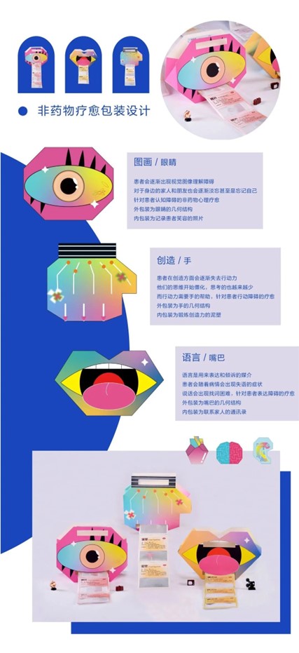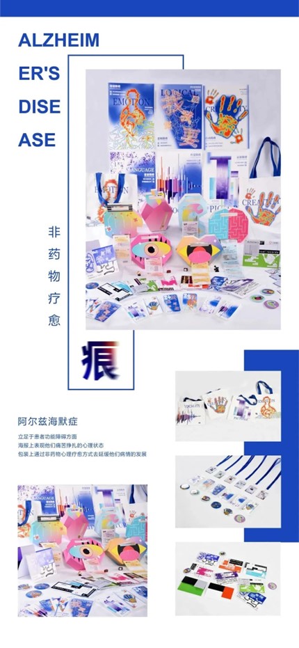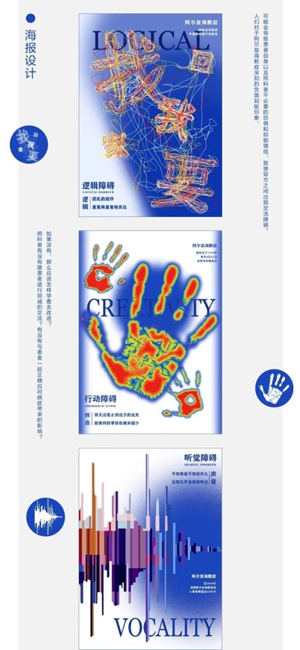 设计说明:阿尔兹海默症,是一种起病隐匿的、进行性、长期发展且不可逆的病理性神经失调症。近年来,患病者逐渐呈现年轻化趋势,一直以来它给大众传递的是沮丧、严肃的感受。本课题以艺术疗愈的角度来探究阿尔兹海默症,从普及相关专业知识和关爱阿尔兹海默症患者的初衷出发,立足于患者可能会出现功能障碍的六个方面:逻辑、创造、语言、声音、图画、情感,进行海报、创意包装及衍生品设计。作品以弥散、抽象的视觉风格,直观地呈现患病者的主观感受。希望以非药物心理疗愈、积极勇敢面对的方式,鼓励呼吁社会主动关注和理解阿兹海默症患者,给予该群体更多的关爱和一个良好的社会环境。
