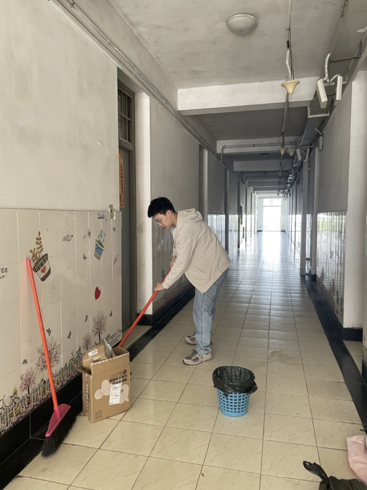 寝室劳动之星:21定向班,立业园8号楼408寝室的两位同学,在打扫完自己寝室的卫生后,发现楼层走廊上由于长期没人打扫积累了许多灰尘。于是,两位同学主动拿上拖把、扫把等打扫工具,将五楼的走廊从头走到尾打扫了一遍。经过两位同学的辛勤劳动,走廊变得干净整洁,他们用自己的劳动为大家创造了良好的寝室公共环境。