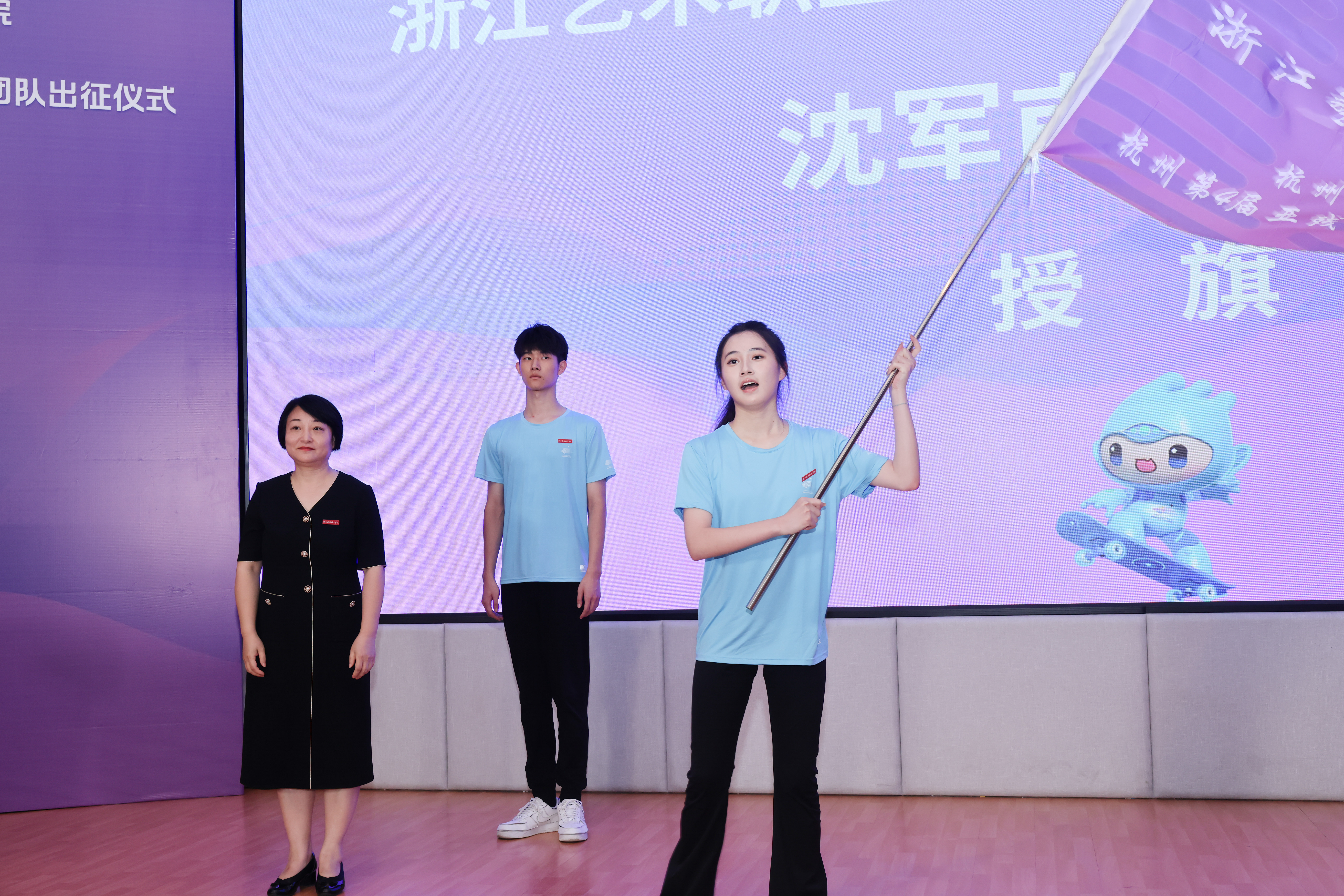 全体亚运会群演誓师宣誓:服务亚运,奋斗有我。助力梦想,青春闪耀。让我们以青春之力,为浙艺争光,为亚运添彩。