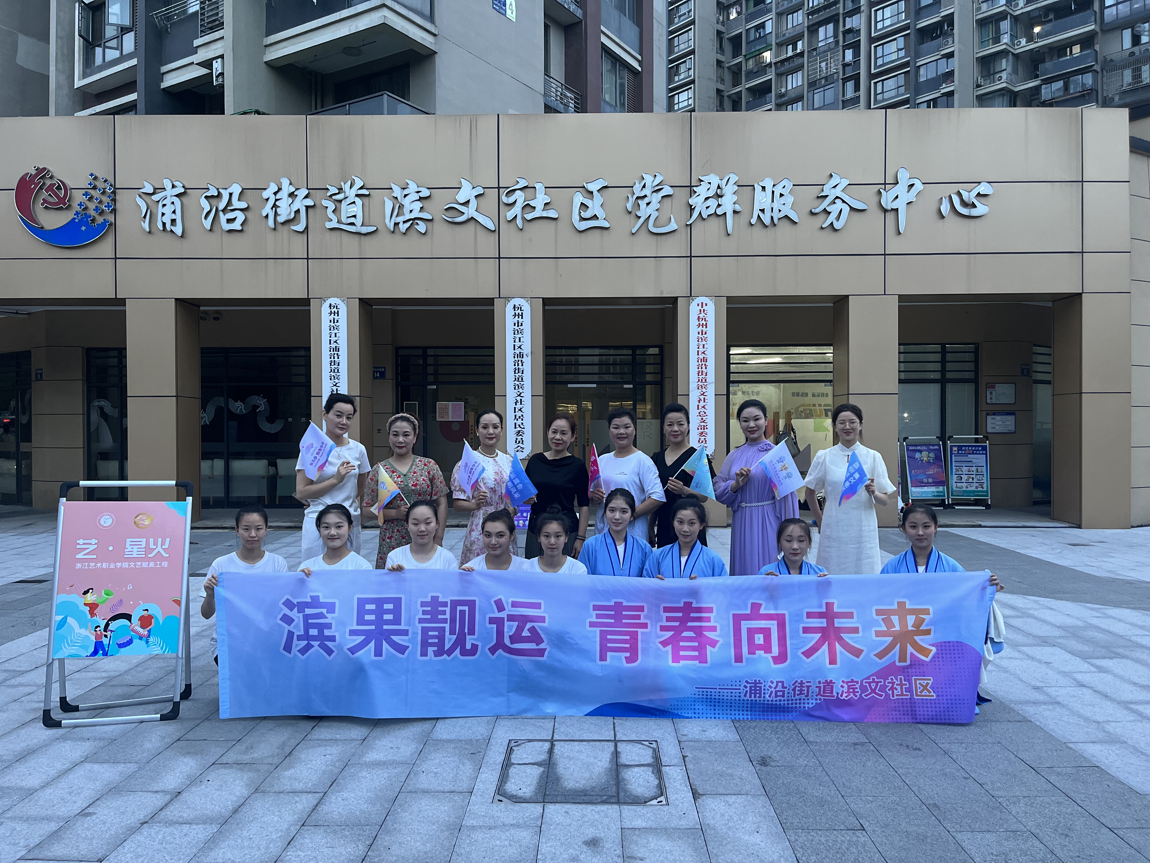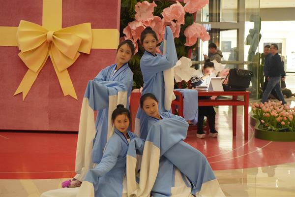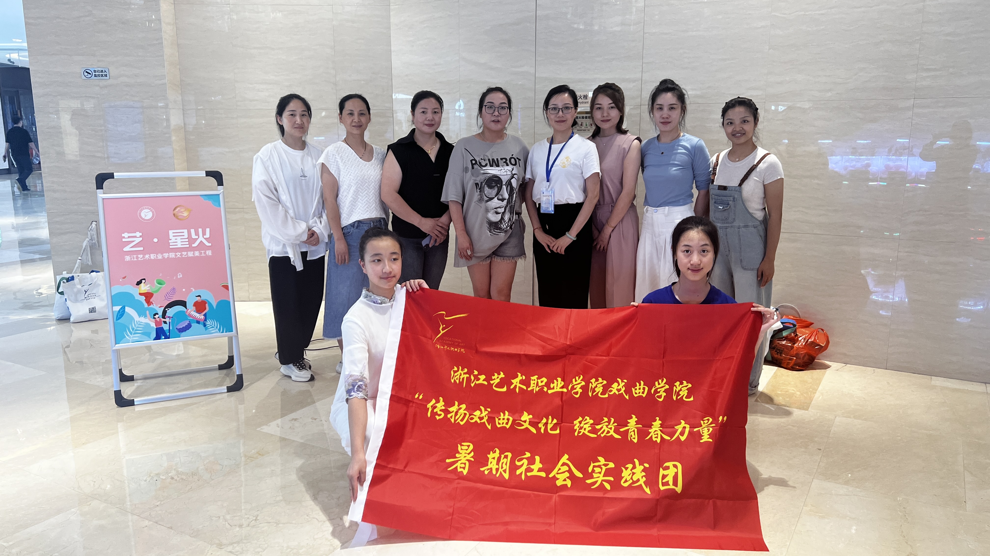 在缪海洁和耿绿洁两位老师的带领下,实践团成员与民营剧团学员组队,来到滨江艺术空间、宝龙城、滨文社区等地开展“文艺赋美”演出活动,丰富了民营剧团学员的培训内容,激发了民营剧团演员的学习热情,坚定了传播越剧艺术的文化自信。