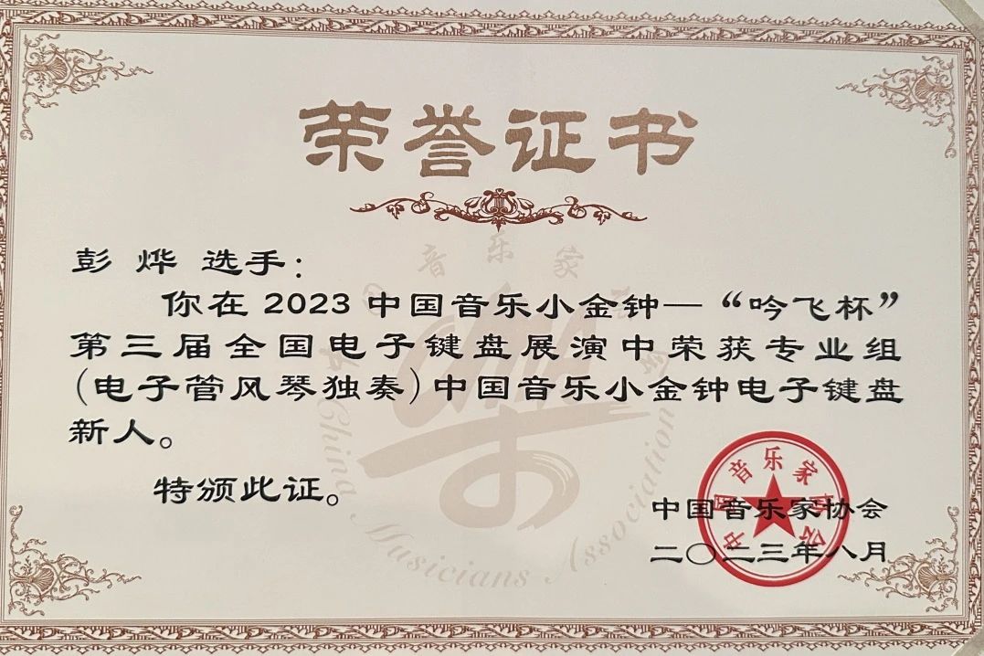 近日,由中国音乐家协会、中共常州市委宣传部主办,中国音协电子键盘学会、吟飞科技(江苏)有限公司共同承办的2023中国音乐小金钟——“吟飞杯”第三届全国电子键盘展演在江苏常州举办。我校音乐学院音乐表演(键盘)专业学生彭烨喜获新人奖(铜奖)。