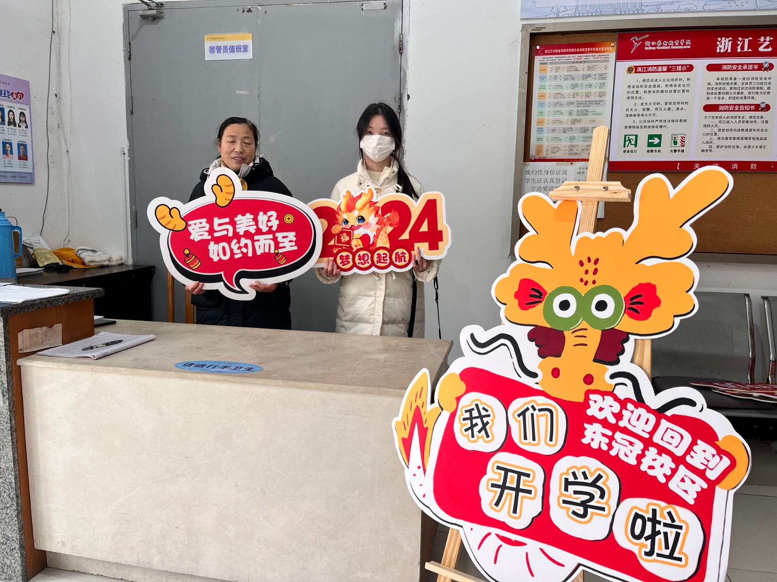 初春相见,甚是欢喜。2月25日,浙艺学子们如约而至,校园瞬间热闹了起来。为营造温馨美好的公寓环境,元气满满的开学氛围,学工部公寓管理中心早早将学生公寓门前布置一新,管理员们以崭新的面貌、饱满的热情欢迎同学们返校回家。