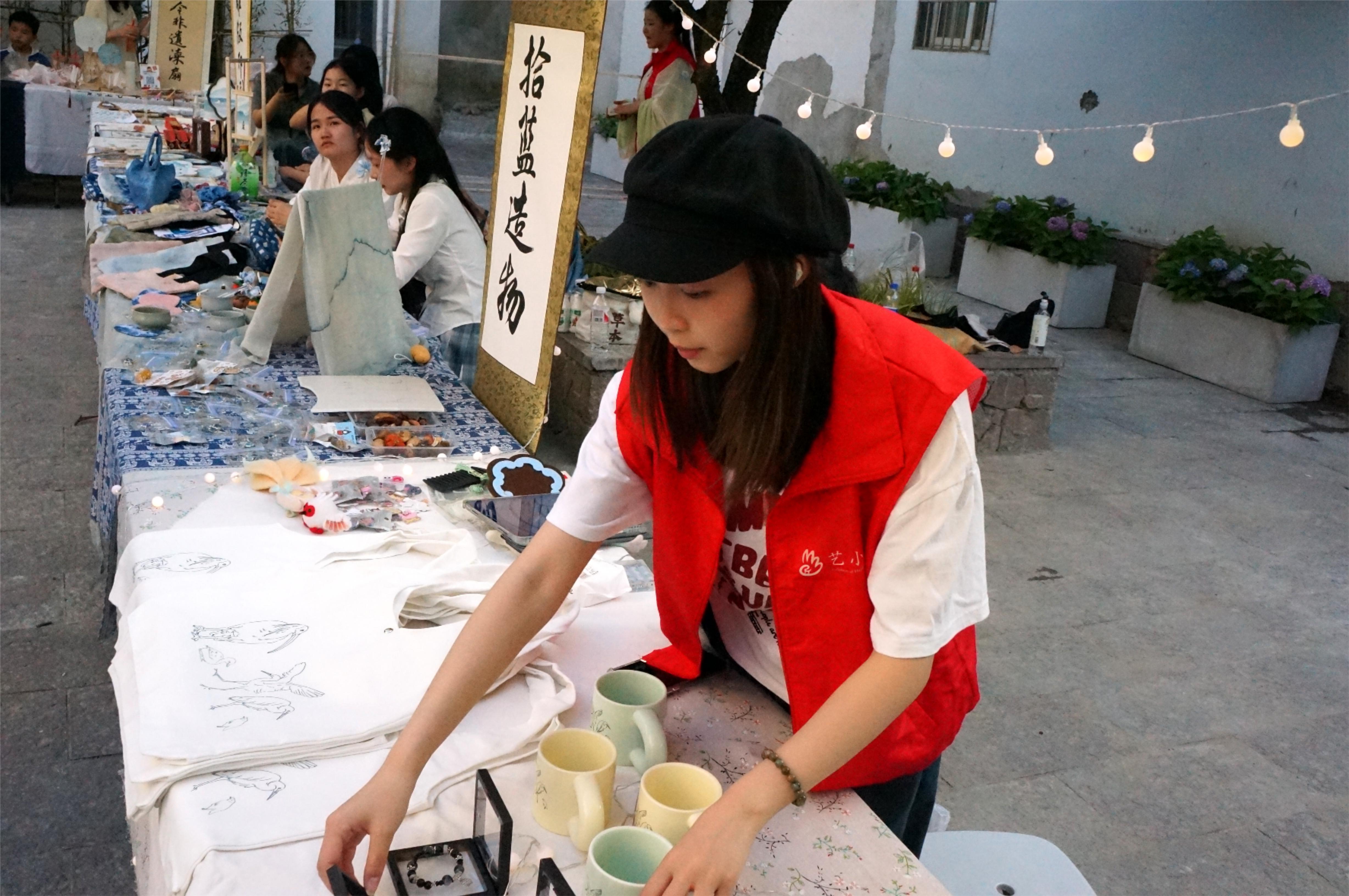 手工艺学院结合专业课程,以独特的创意打造了具有民族特色的传统手工艺品,市集上产品琳琅满目,蓝染的挂件与饰品被游客反复观赏和称赞,精美细腻的瓷器引得游客频频驻足,还有水印木刻的挂历、蓝染的丝巾和头饰、手绘的木扇......古老的传统技艺在这里绽放出活力之花,在一件件精心打磨的作品中传递出新的生命力。